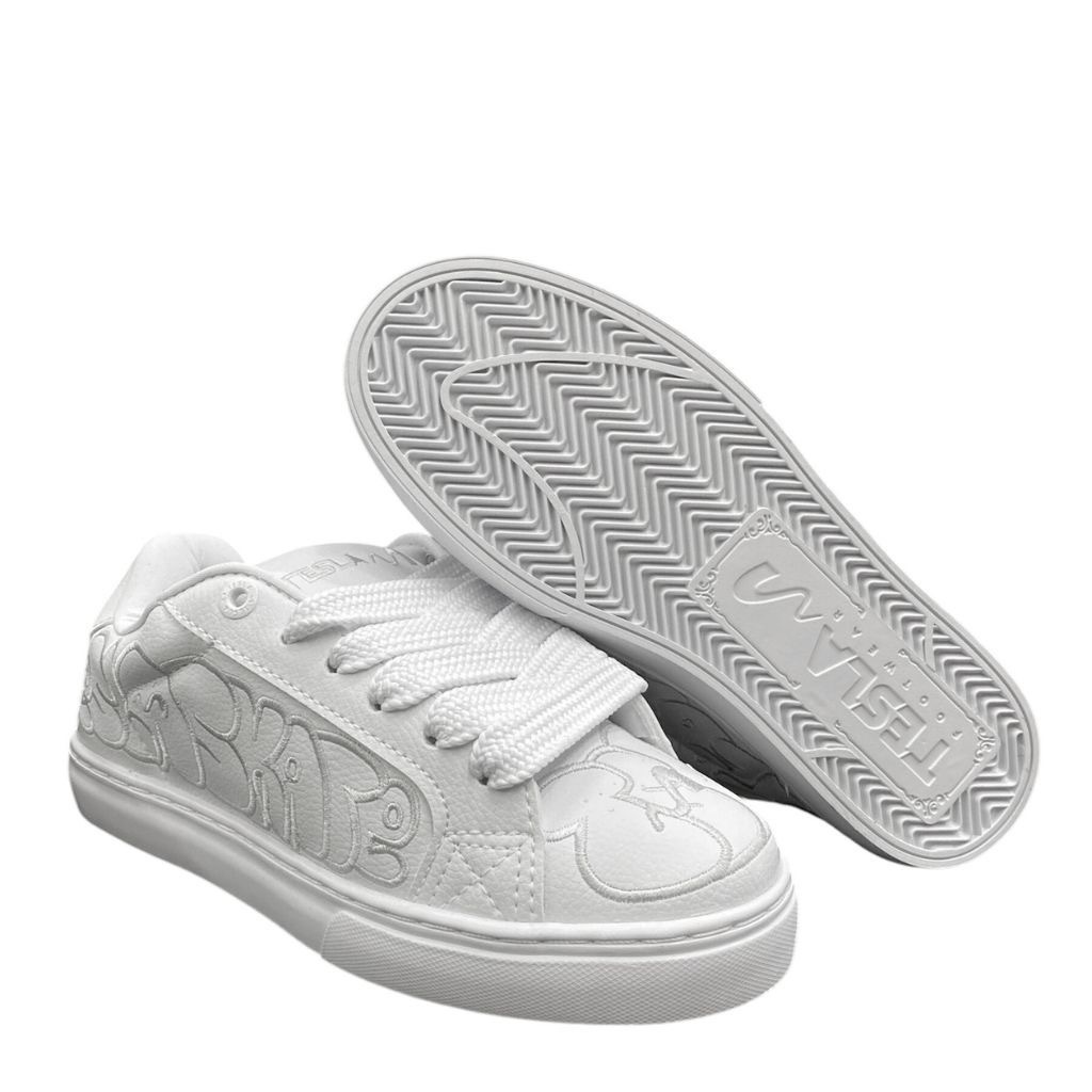 Tênis Tesla Hertz Black Art desenvolvido em PU Sintético branco com detalhes em bordado branco. Tênis Tesla Hertz Black Art forrado com tecido de poliéster de alta resistência e espuma de alta densidade para maior conforto, espuma em pu para absorver impacto e sola de borracha de alta performance e durabilidade com costura lateral.